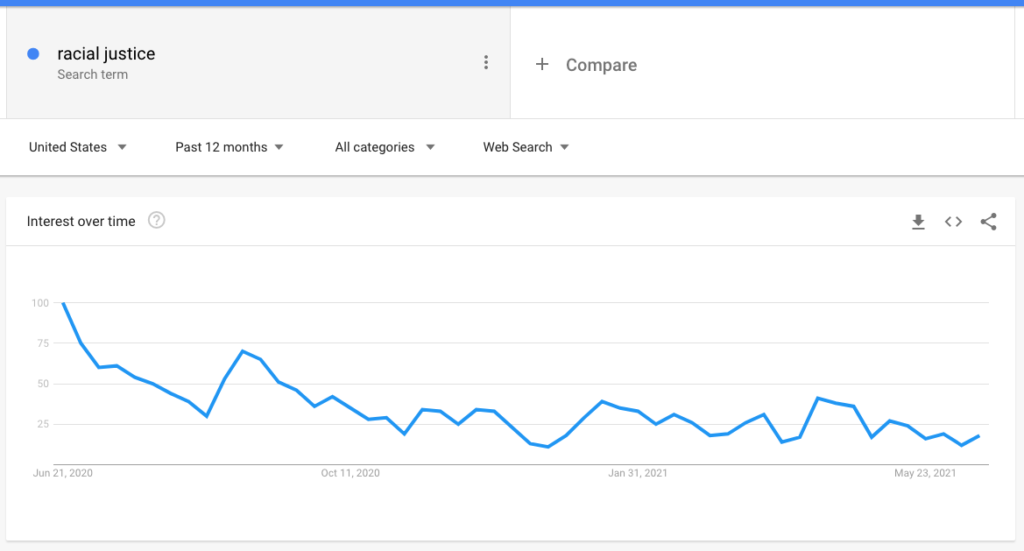 Racial justice has become a hot topic particularly in the past year or two. My own personal recollection is that much of it was kicked off by George Floyd’s death back on May 25th, 2020. If Google searches for “racial justice” is any indicator, a lot of the momentum for change in the public consciousness has died down since then, which is sad. I remember posting last June about how “fighting racism is a marathon, not a race.” Is making Juneteenth a national holiday even considered “racial justice?” Or, is it more like presenting the bare minimum needed to maintain image, like many companies jumped to in the aftermath of BLM and Stop AAPI Hate?
